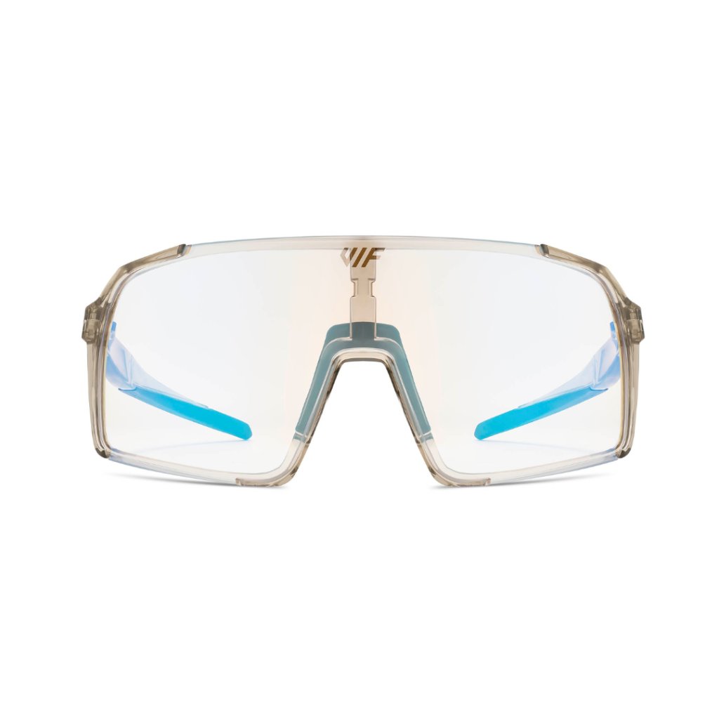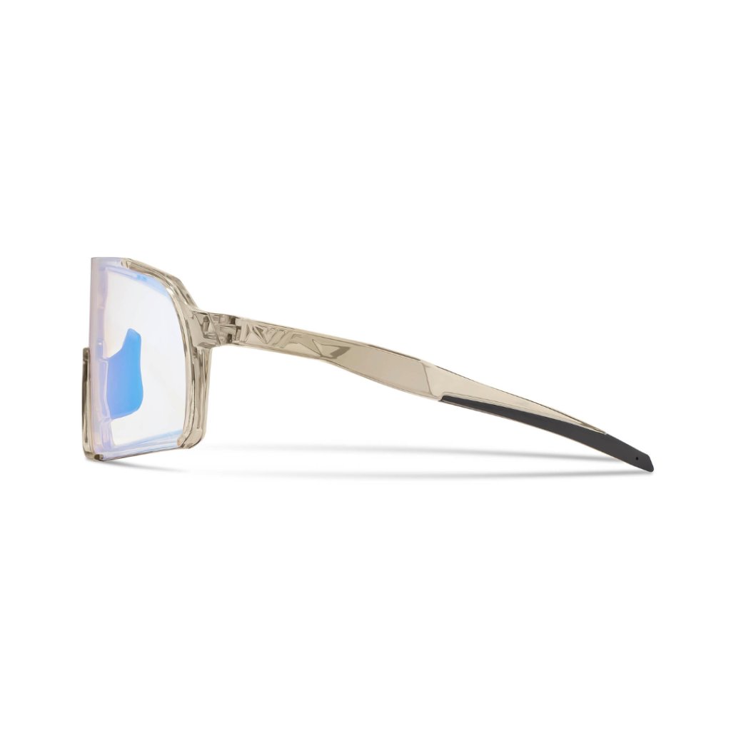 Materiál: Sklá sú potiahnuté špeciálnym hydrofóbnym filtrom, ktorý je odolný voči poškriabaniu a odpudzuje vodu, takže aj v daždi zostávajú sklá dokonale priezračné. Okuliare obsahujú len jeden fotochromatický zorník s jemným tónovaním a modrým odleskom, ktorý je v tieni ľahko tónovaný a na slnku sa stmaví do kategórie S1. Vďaka jednoduchému systému uchytenia zorníka dokážete sklo vymeniť za menej než 3 sekundy. Protišmykové nosníky a nožičky zabezpečia stálu polohu okuliarov pri akejkoľvek športovej aktivite. Gumené zakončenie nožičiek znamená komfort aj pri dlhšom nosení okuliarov a predovšetkým bezpečie pri prípadnom páde.